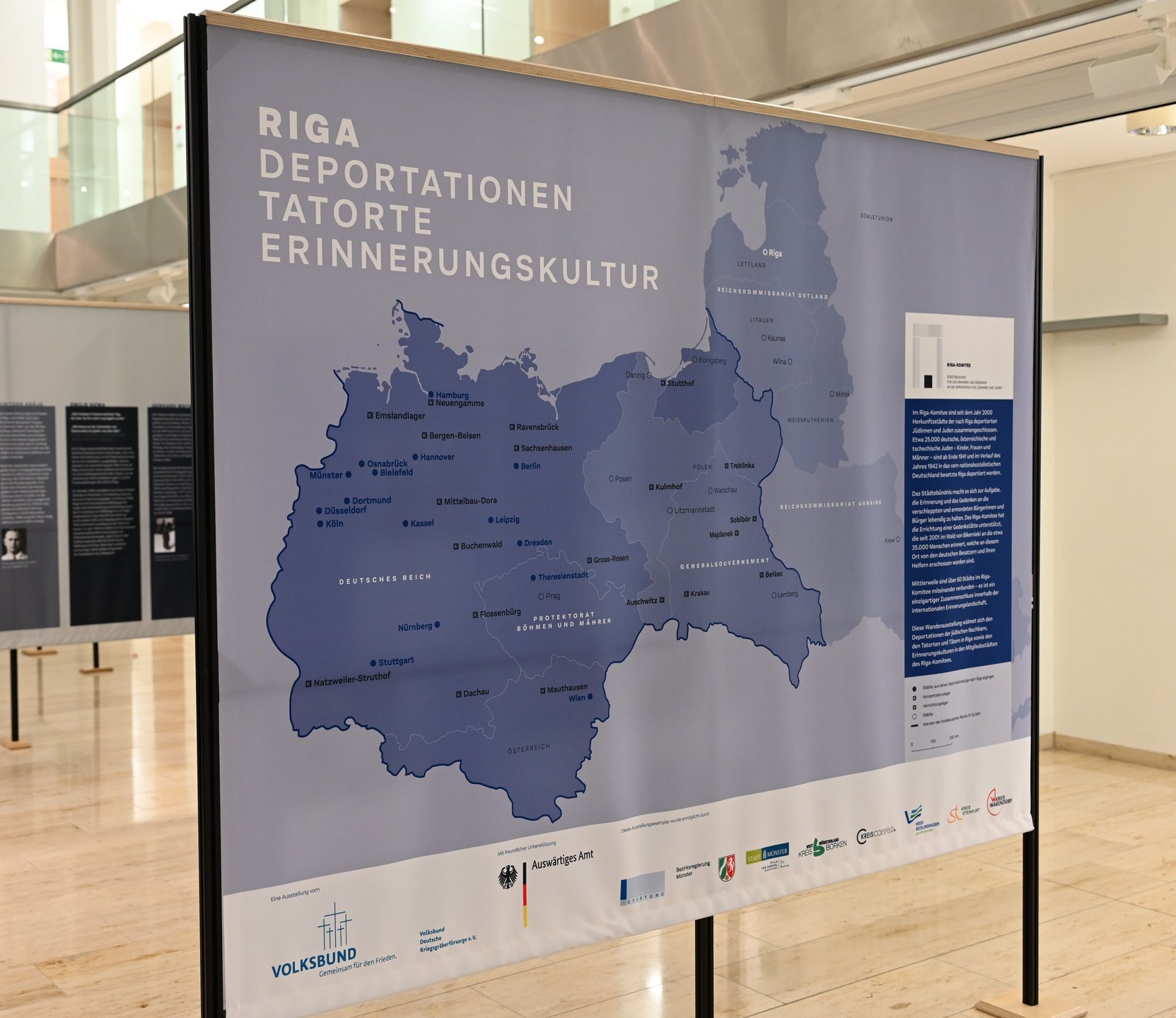 Der Regionalgeschäftsführer des Volksbundes, Jens Effkemann, betonte bei der Eröffnung: „Die Ausstellung macht deutlich, wie sehr die Kommunen aus der Region sich beim Gedenken an die Menschen jüdischen Glaubens einsetzen, die im Winter 1941/42 nach Riga deportiert wurden. Nicht ohne Grund sind 30 von bundesweit aktuell 74 Mitgliedsstädten des vom Volksbund initiierten Riga-Komitees aus dem Regierungsbezirk Münster.“