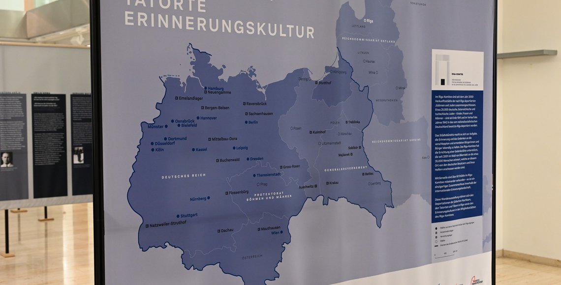 Münster. Auf Initiative seiner ehemaligen Vorsitzenden Dorothee Feller hat der Bezirksverband Münster Volksbund ein eigenes Exemplar der neuen, bundesweiten Wanderausstellung des Riga-Komitees erworben. Dank mehrerer Zuwendungsgeber konnte das Projekt realisiert werden. Am 30.11.2022 wurde die Ausstellung in der Bezirksregierung Münster eröffnet. Die folgende Presseinformation der Bezirksregierung fasst die gelungene Veranstaltung zusammen, die neben dem Gedenken auch einen Ausblick in die Gegenwart sowie Zukunft beinhaltete: